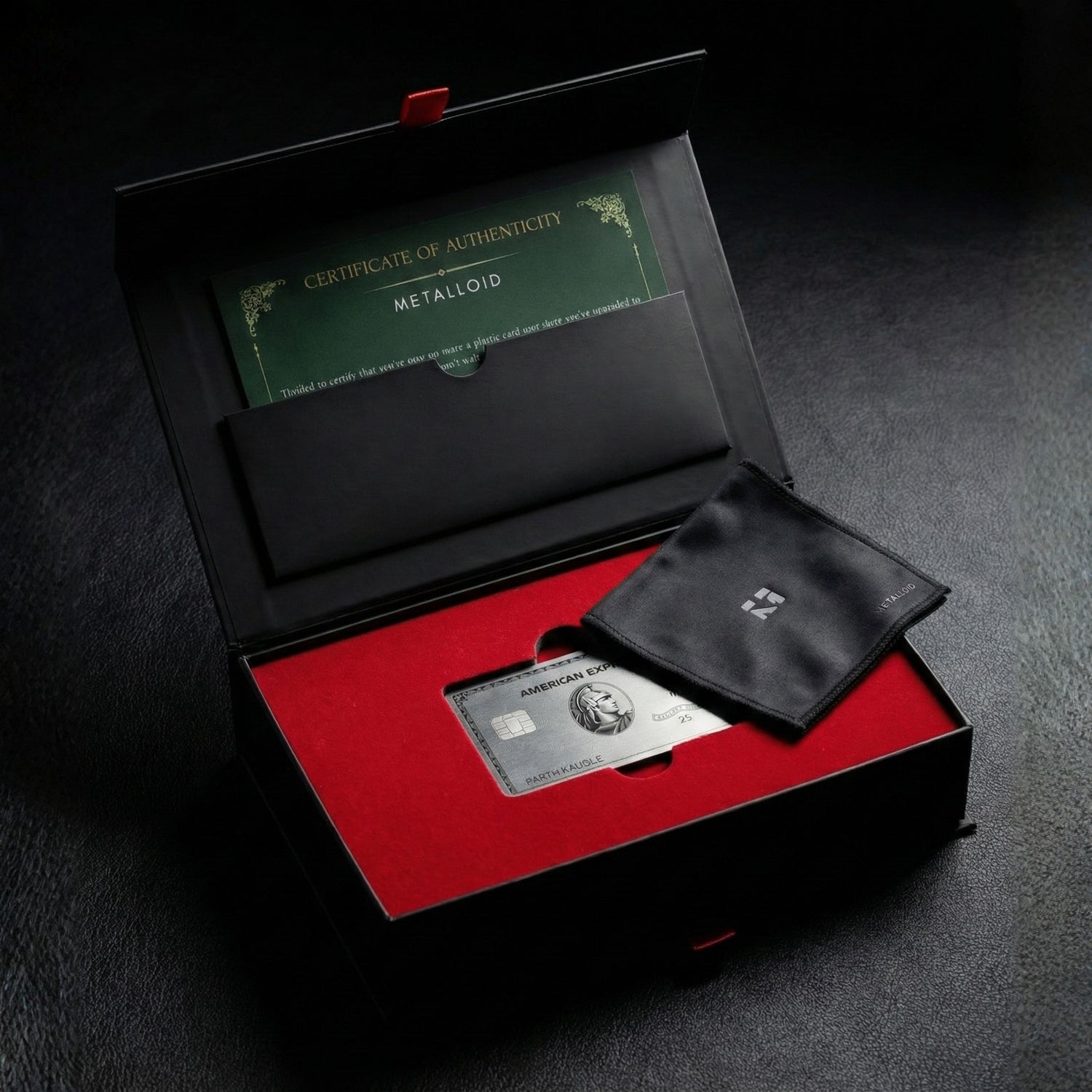 Unboxing your Metalloid Card feels special from the start : a solid, premium box opens to a soft fiber cloth, a personal Certificate of Authenticity with a simple care guide and finally at the heart of it your fully customised metal card, crafted with pride and perfection.